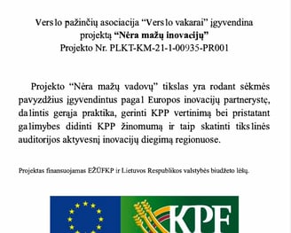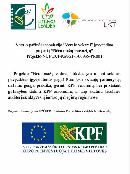 Projektą „Nėra mažų inovacijų" pagal Lietuvos kaimo plėtros 2014-2020 m. programos priemonės „Techninė pagalba" veiklos sritį „Lietuvos kaimo tinklas" įgyvendina Verslo pažinčių asociacija „Verslo vakarai"